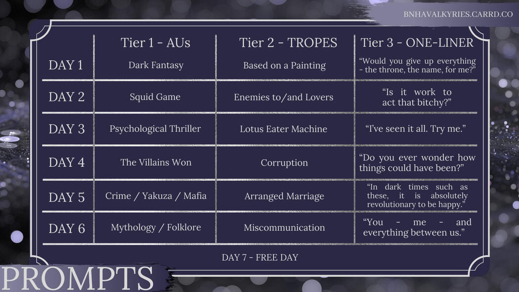 × Works have to feature a F/F ship× Works must be new and not yet posted elsewhere. Sequels, prequels, spin-offs, etc. are allowed.× Do not post your works earlier — e.g. Prompt 6 on Day 1. Note: differences in timezones do not count as posting early.× While you only need to create for one prompt per day, there is no maximum limit for how many prompts you'd like to use.× There are no content restrictions, however we will only share works that are tagged properly — no matter the type of fan work.× Please do tag us with @bnhavalkyries and use #bnhaValkyries so we will be able to share your post!× Please write out content warnings completely, do not "censor" them with asterisks or we will not share your posts!× Feel free to add your works (no matter if writing, art or else) to our AO3 collection: BNHA Valkyries