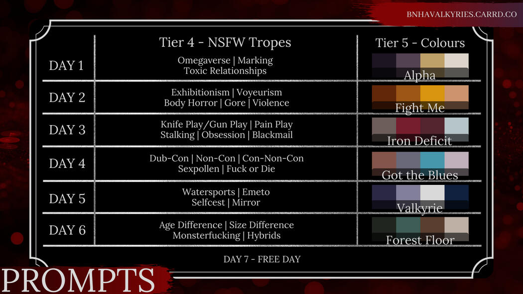 | Day | Tier 1 - AU | Tier 2 - Trope | Tier 3 - One-Liner | Tier 4 - NSFW |